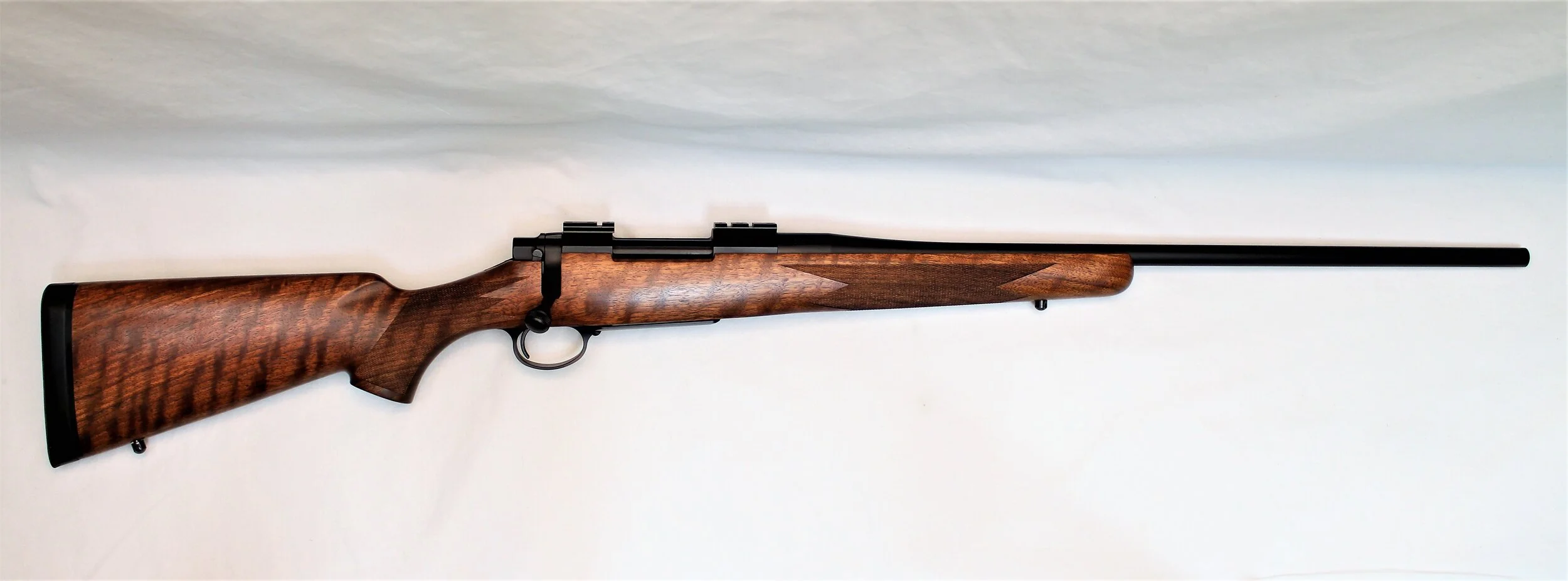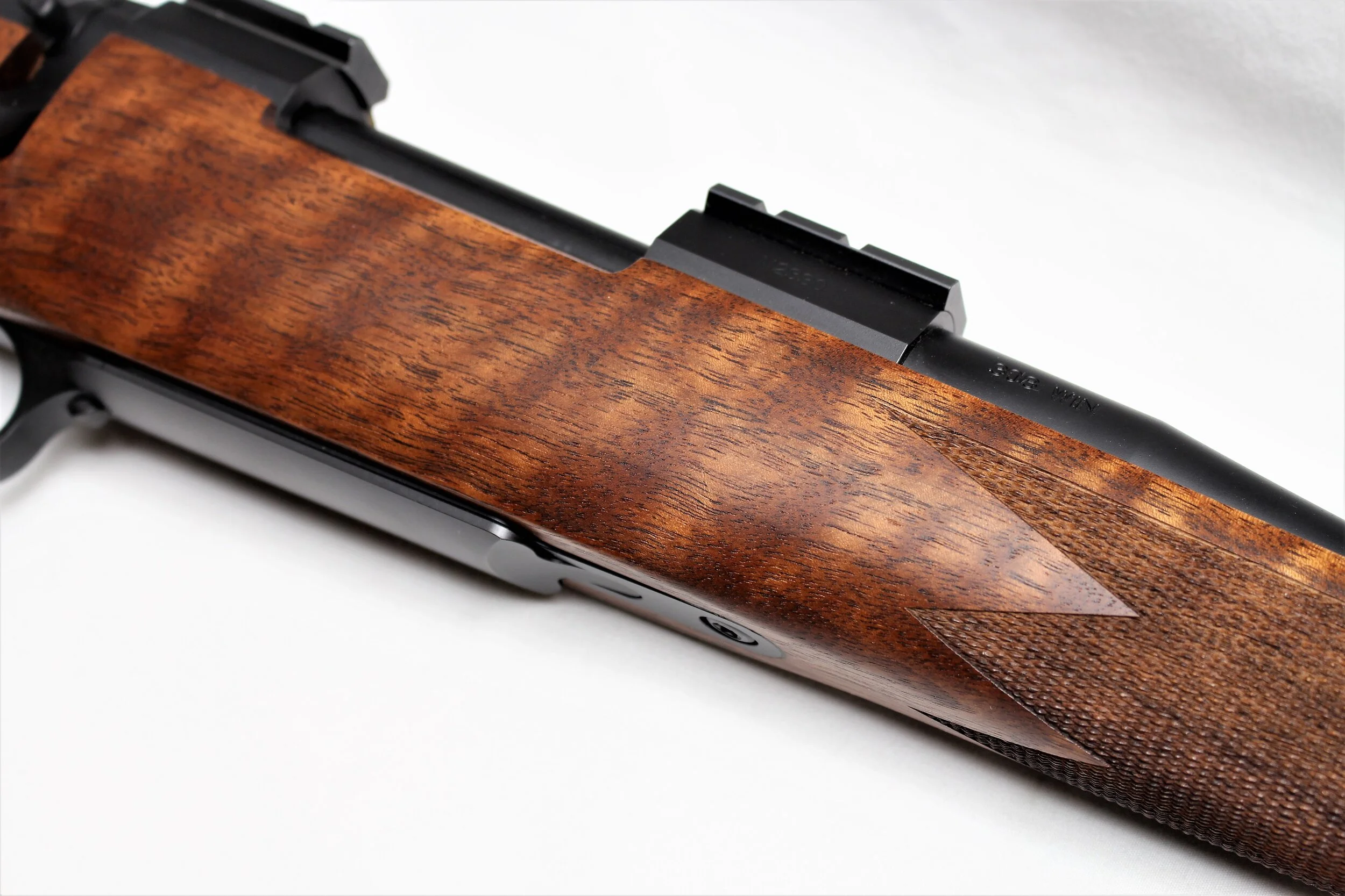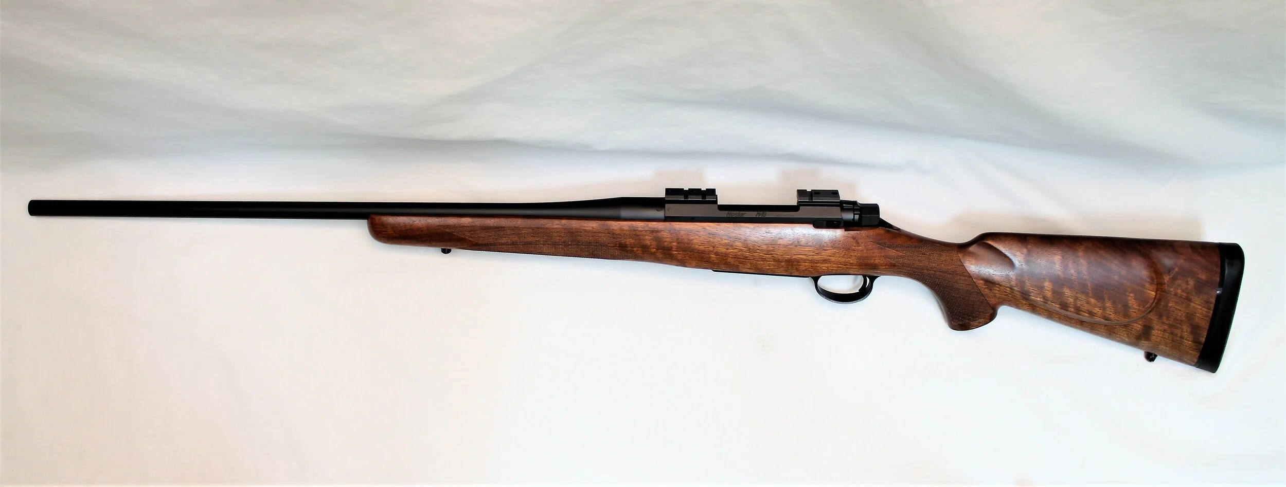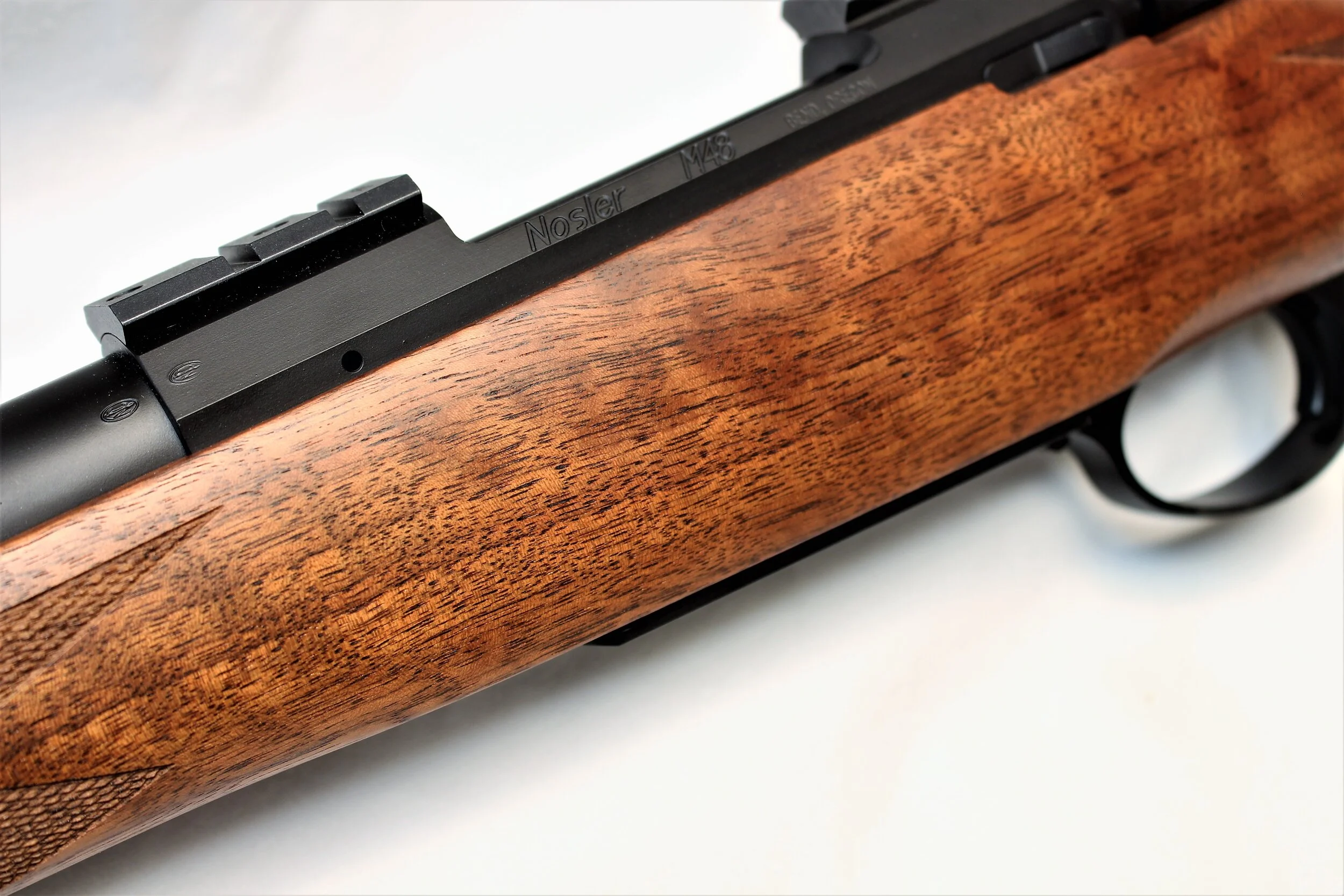 Excellent condition Nosler M48 rifle with exceptionally low round count if any. We put a bore scope in the chamber and throat and found almost no wear at all. The stock is also looks great and we were unable to find any nicks or dents. Speaking of the stock, it has very nice grain structure with the flow of the grain running down through the grip and strait in the action aria. There is also a good amount of fiddle back for figure giving the rifle a very rich look.