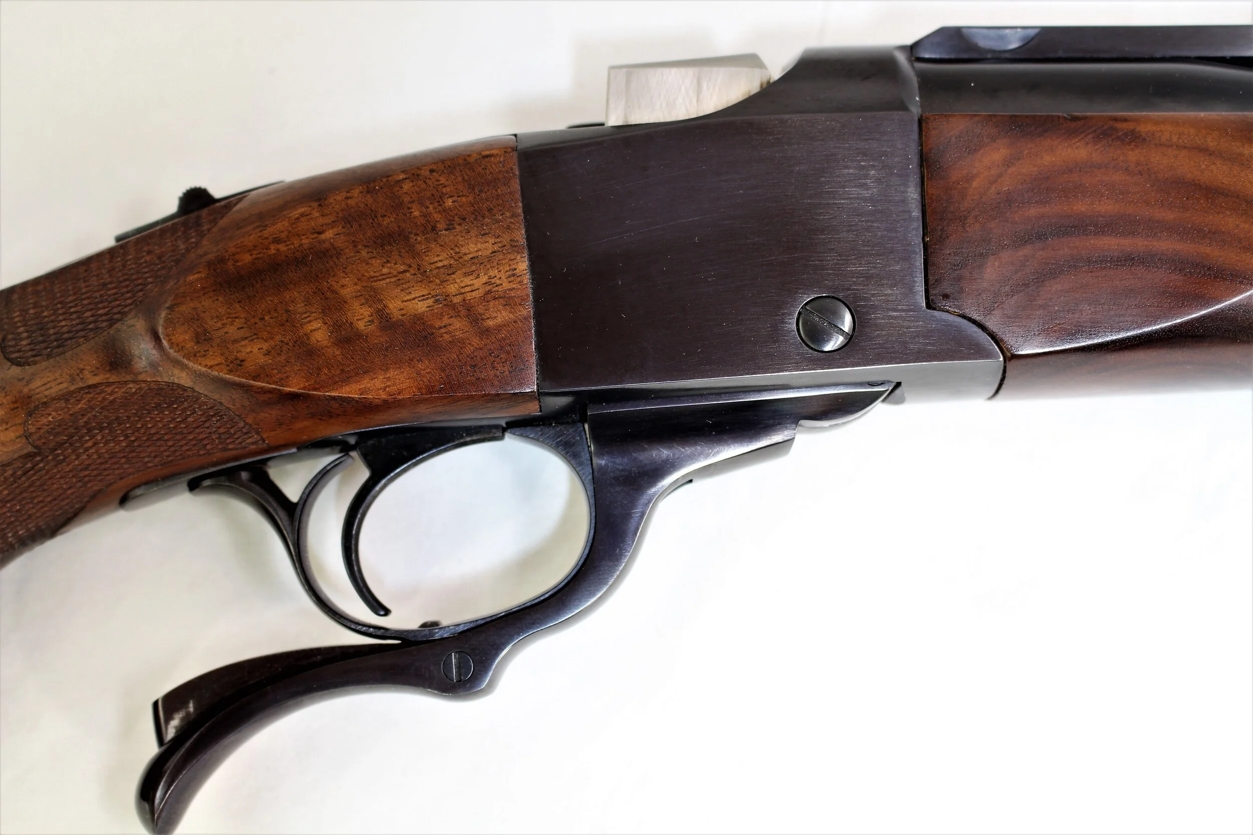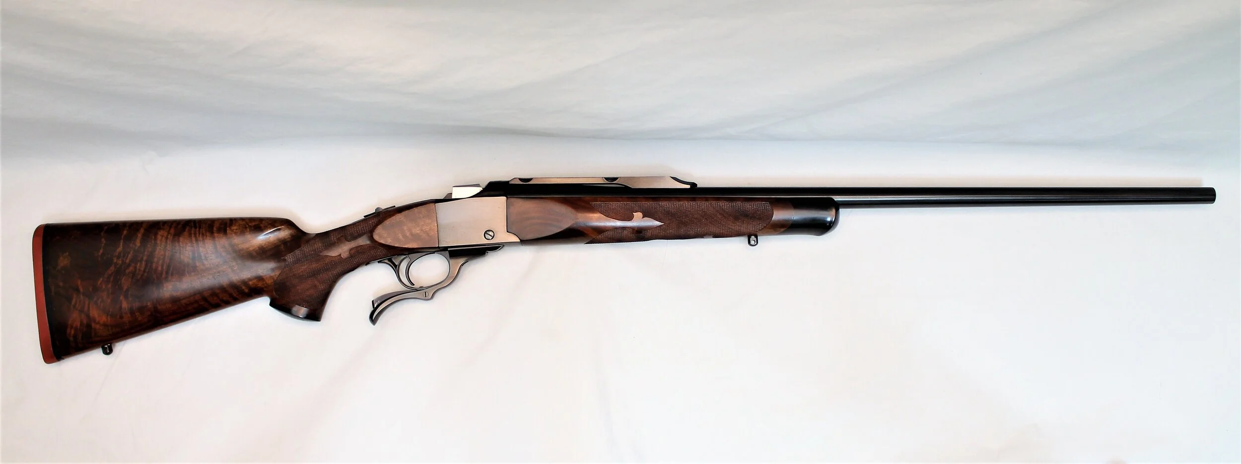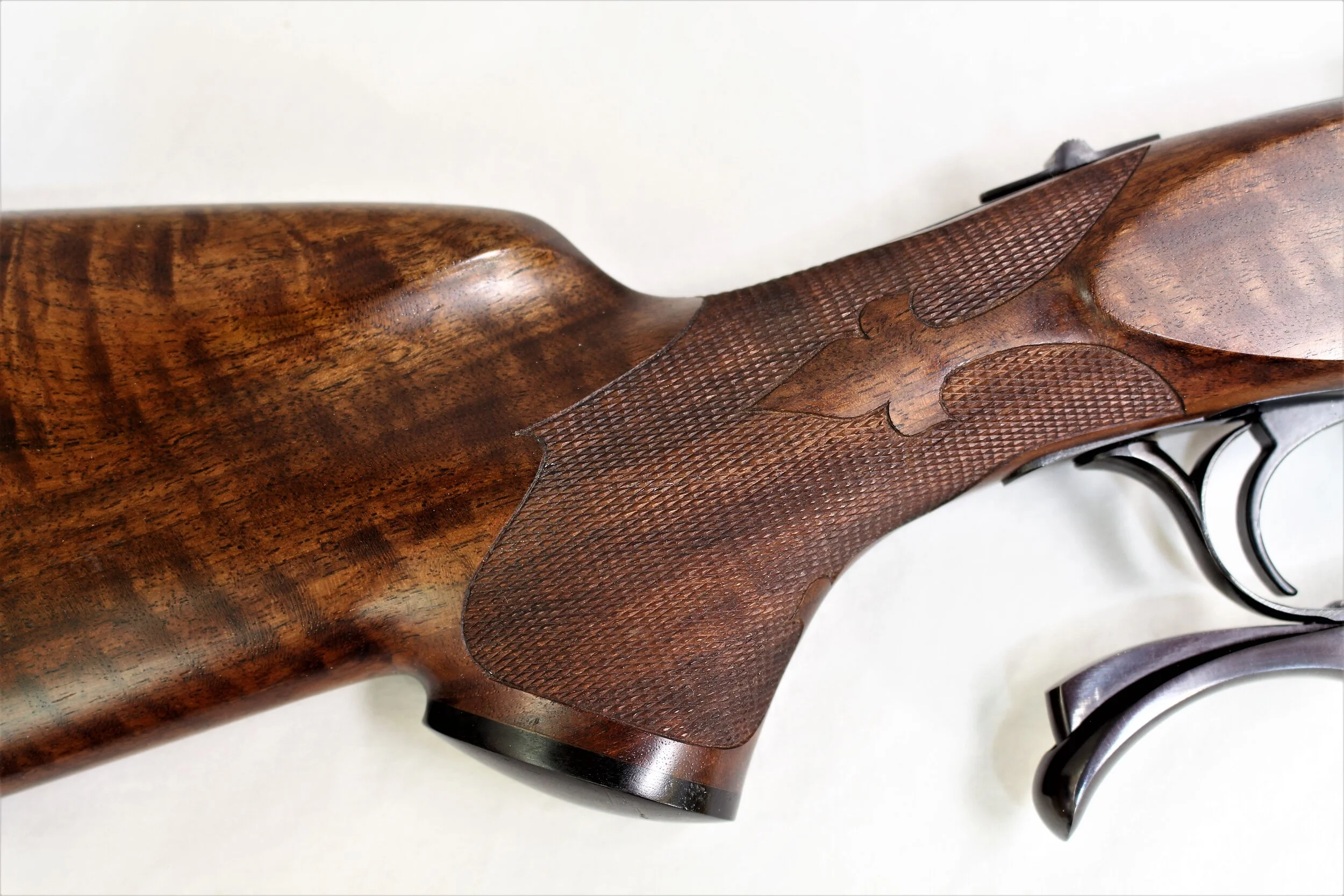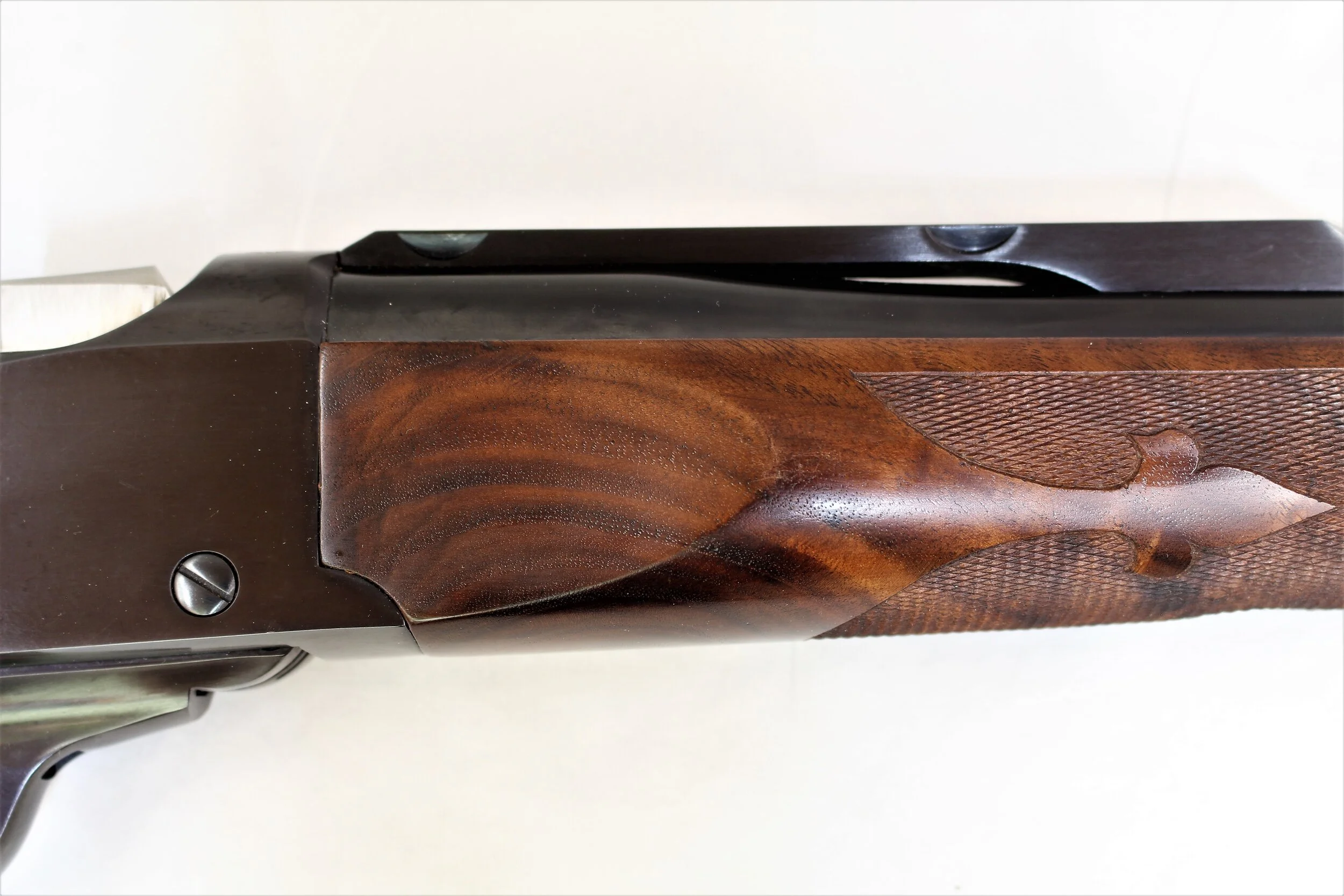The stock blank alone on this Ruger No.1-B was estimated by a rifle specialist to be worth $2500.00. Then it was fit, finished, and checkered by master stock maker; Bill Marsh of Idaho Falls, Idaho. The checkering is cut, one line at a time by hand, 28 lines per inch, and close inspection of the pictures will show you perfection, all the way around. In addition; we are unable to see that this rifle has ever been fired as the barrel and throat show no signs of wear under a borescope. We also have the original Ruger box the rifle was shipped in, 1" scope rings, and the manual but the hang tags were not retained. There is, if you look closely, a small amount of damage to the screw hole on the bottom of the forend and on the grip cap but we believe a competent stock maker could repair it. We are going to pay the shipping on this one as we want to ship it fully insured and double boxed and so it is going to be expensive. The barrel is 26" long and the rifle weighs 7.74 pounds and has a length of pull of 13.375".