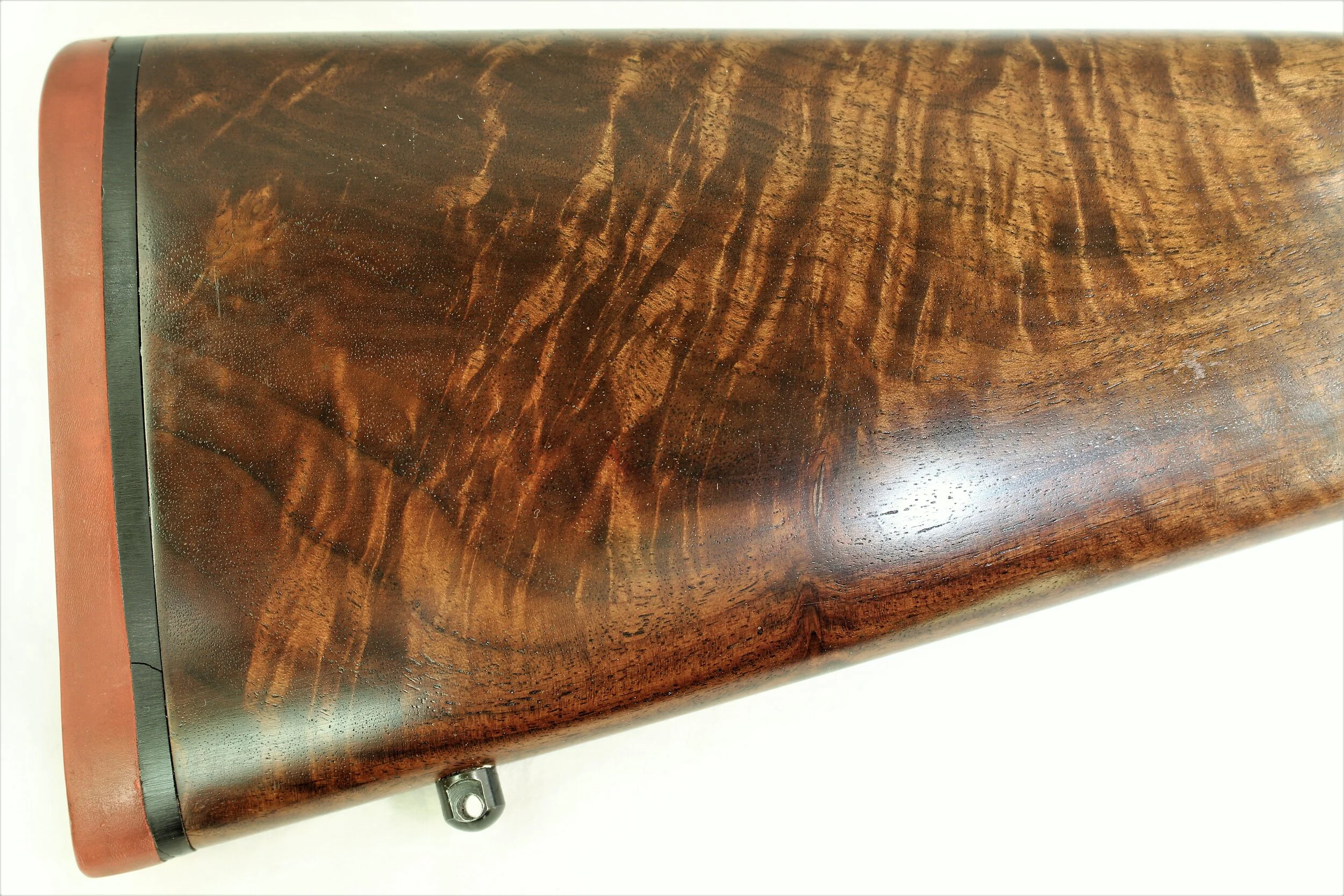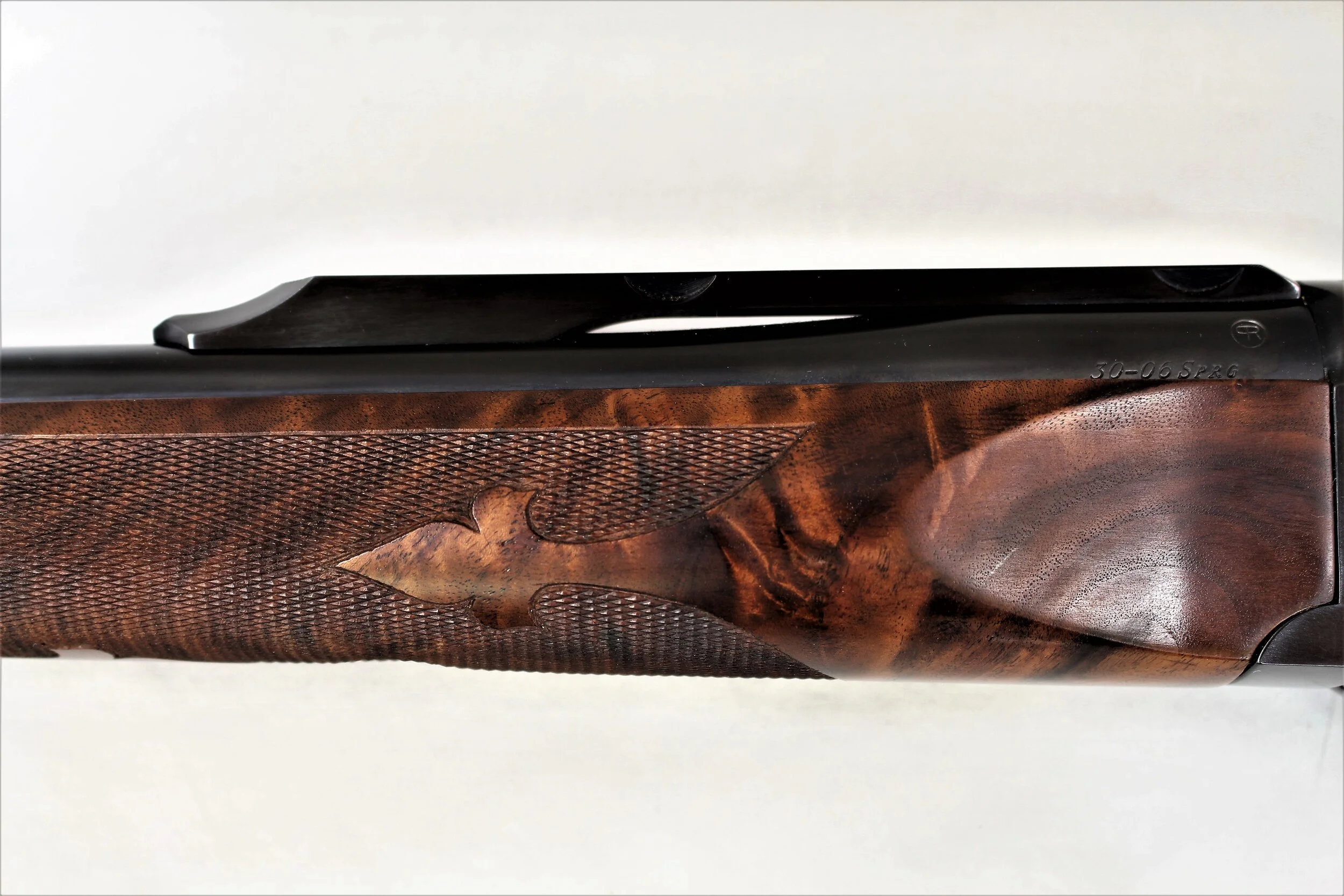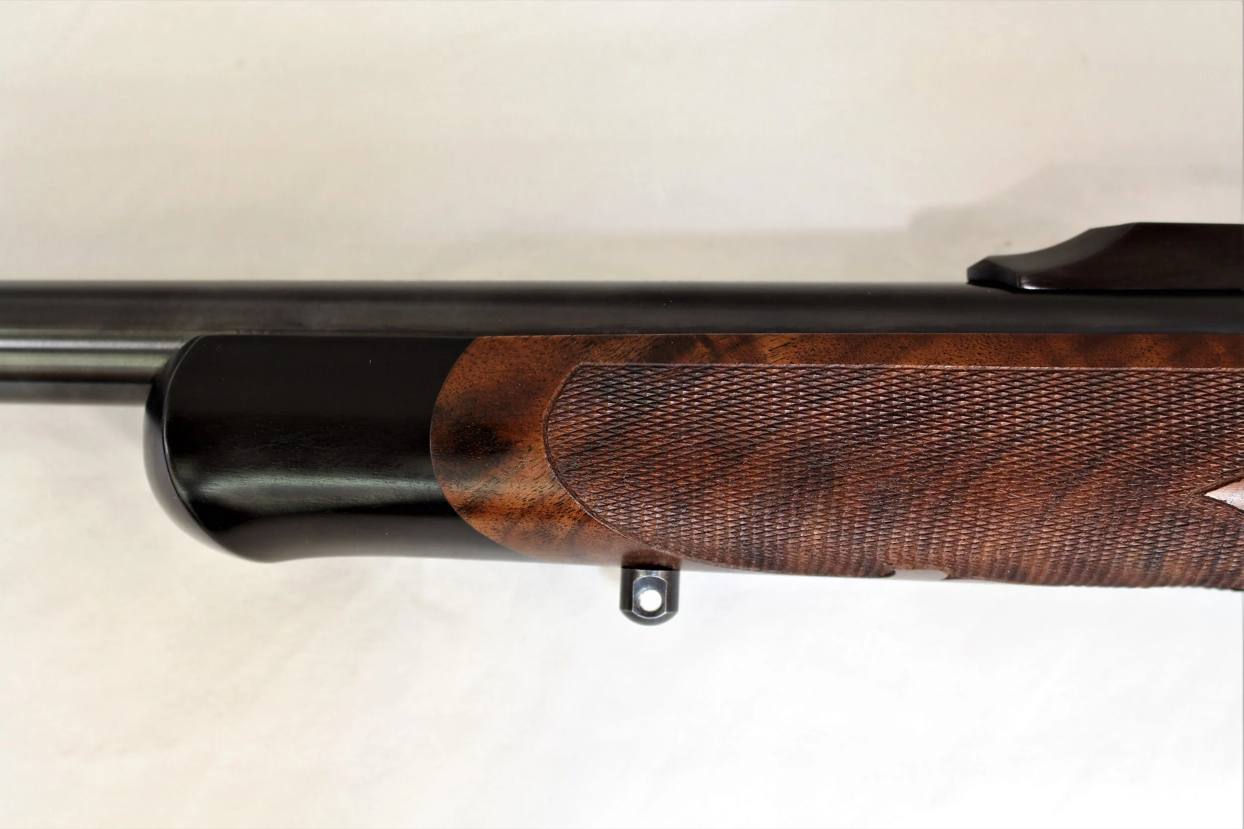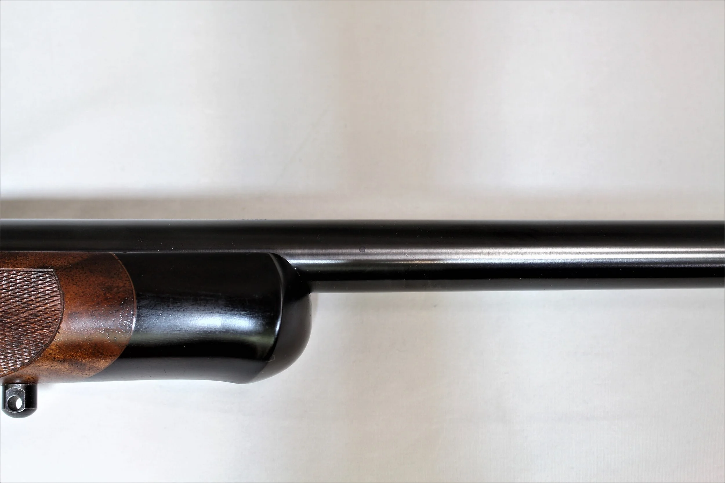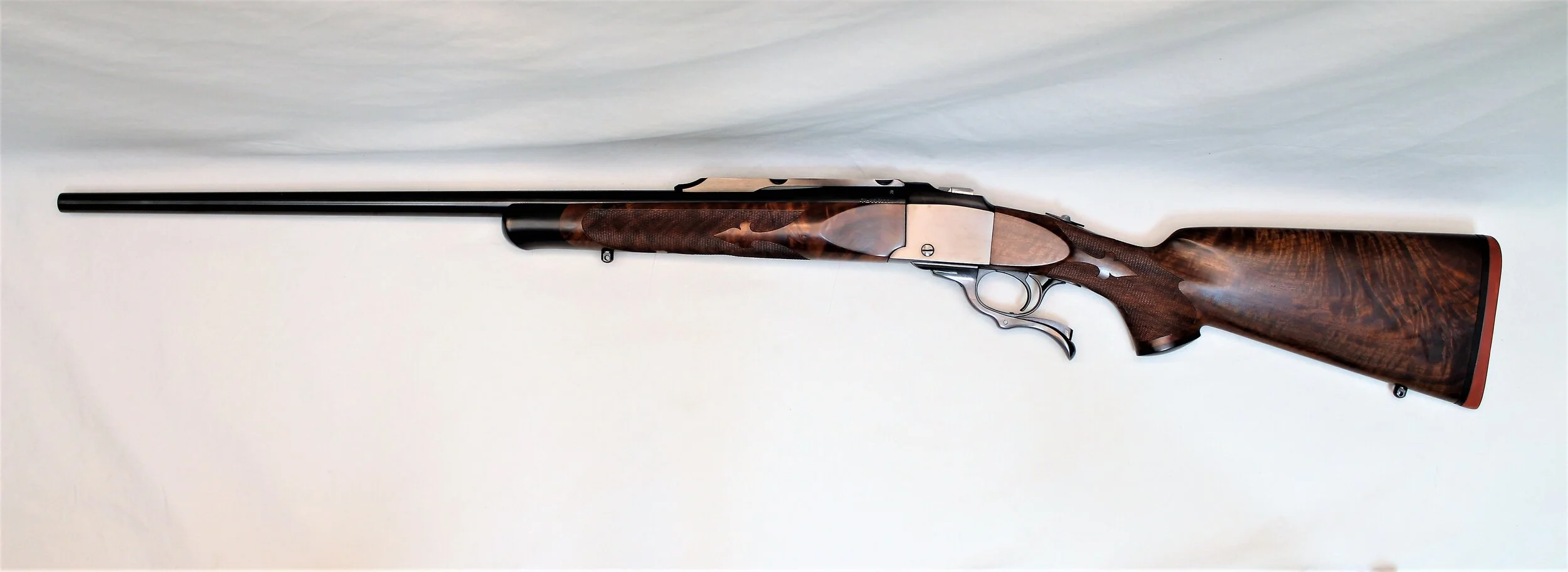 The stock blank alone on this Ruger No.1-B was estimated by a rifle specialist to be worth $2500.00. Then it was fit, finished, and checkered by master stock maker; Bill Marsh of Idaho Falls, Idaho. The checkering is cut, one line at a time by hand, 28 lines per inch, and close inspection of the pictures will show you perfection, all the way around. In addition; we are unable to see that this rifle has ever been fired as the barrel and throat show no signs of wear under a borescope. We also have the original Ruger box the rifle was shipped in, 1" scope rings, and the manual but the hang tags were not retained. There is, if you look closely, a small amount of damage to the screw hole on the bottom of the forend and on the grip cap but we believe a competent stock maker could repair it. We are going to pay the shipping on this one as we want to ship it fully insured and double boxed and so it is going to be expensive. The barrel is 26" long and the rifle weighs 7.74 pounds and has a length of pull of 13.375".