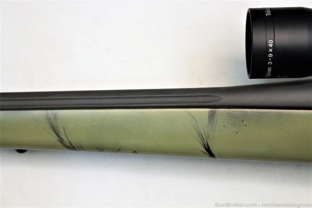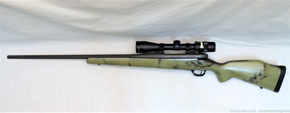 Once in a while a guy has to sell a rifle he really didn't want to. That is the case with the consigner of this rifle but he has no choice and so off to the market it goes. Used to hunt anything and everything in the Idaho wilderness; this rifle has given great service and will continue on with that service for the next owner. At some point in its life, it received a custom paint job and the bedding has been tuned. The barrel still looks clean and bright and appears to be in good condition. The scope is a Trijicon 3-9X40 with the center point lighted Duplex reticle and it is mounted in Talley Light Weight one-piece scope rings.